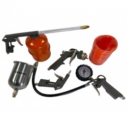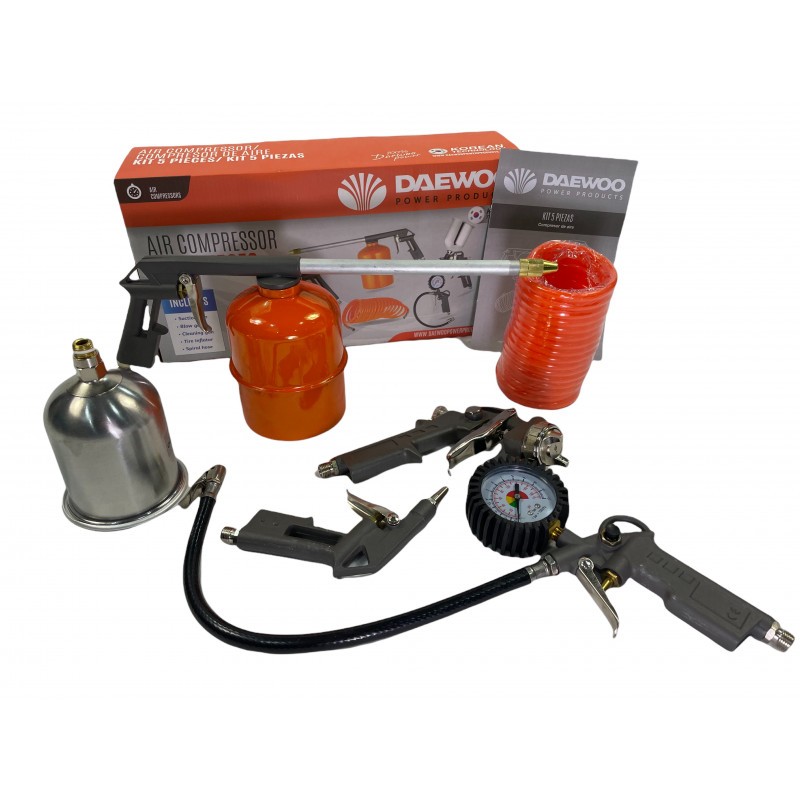 Equipado con una manguera para enchufe rápido, pistola con manómetro para hinchar ruedas, pistola de soplado, pistola de petróleo y pistola de pintura para esmalte sintético, este set versátil y fácil de usar es ideal tanto para aficionados como para profesionales. Con la calidad y durabilidad que caracteriza a Daewoo, este kit de accesorios garantiza eficiencia y comodidad en su uso diario.